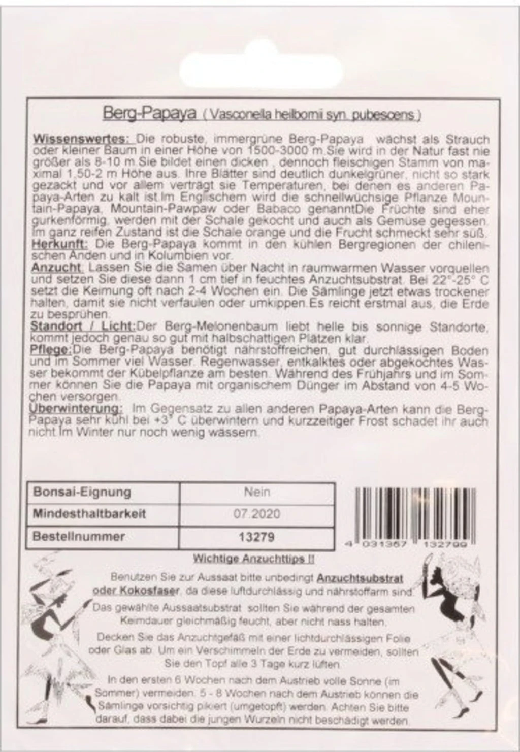 Die robuste, immergrüne Berg-Papaya wächst als Strauch oder kleiner Baum in einer Höhe von 1500-3000 m. Sie wird in der Natur fast nie größer als 8-10 m. Sie bildet einen dicken , dennoch fleischigen Stamm von maximal 1,50-2 m Höhe aus. Ihre Blätter sind deutlich dunkelgrüner, nicht so stark gezackt und vor allem verträgt sie Temperaturen, bei denen es anderen Papaya-Arten zu kalt ist.