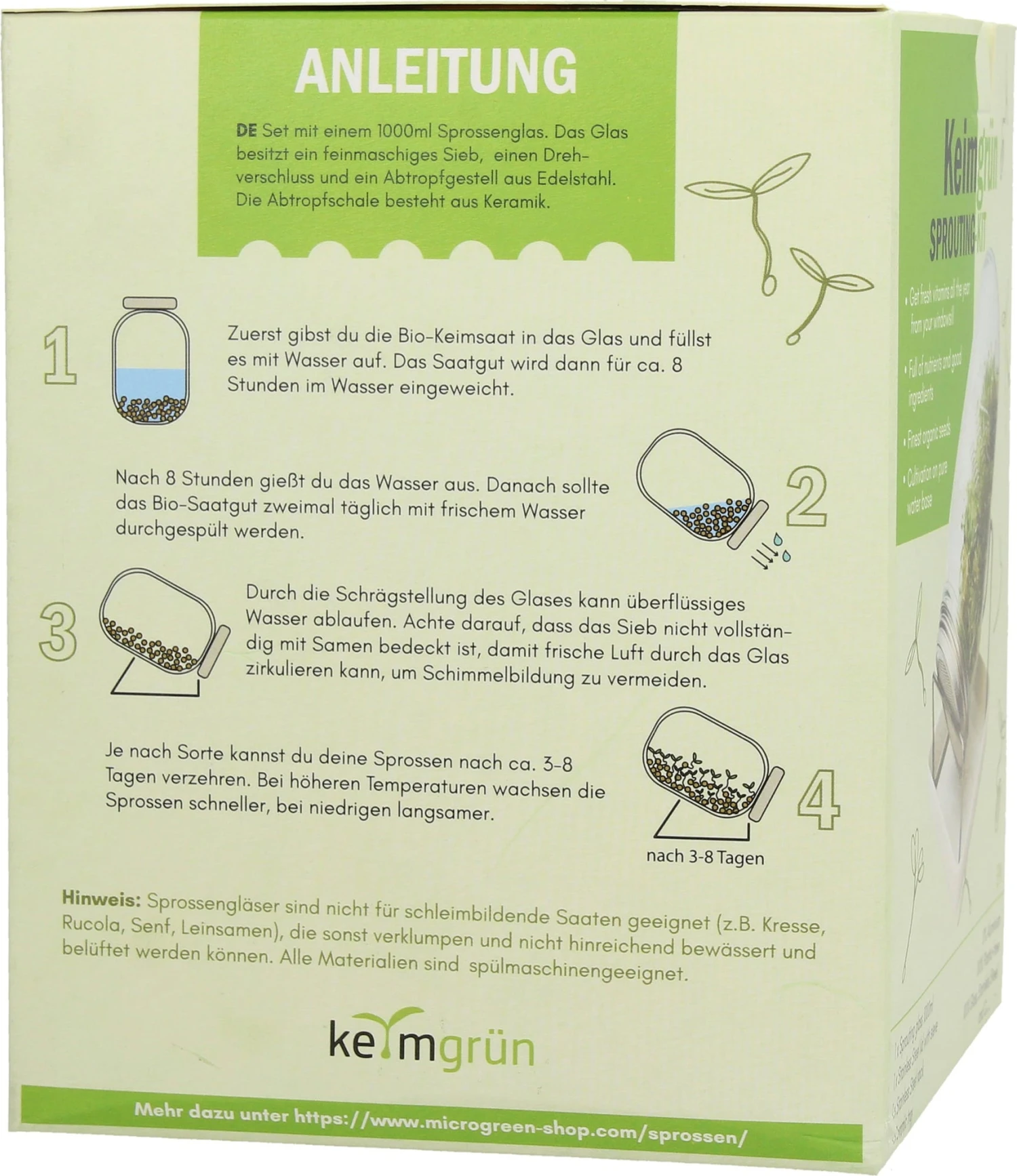 - Schräge Positionierung des Glases garantiert Frische der Sprossen und vermeidet Staunässe