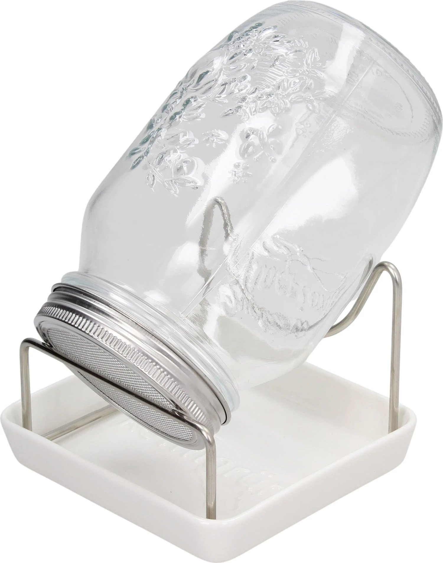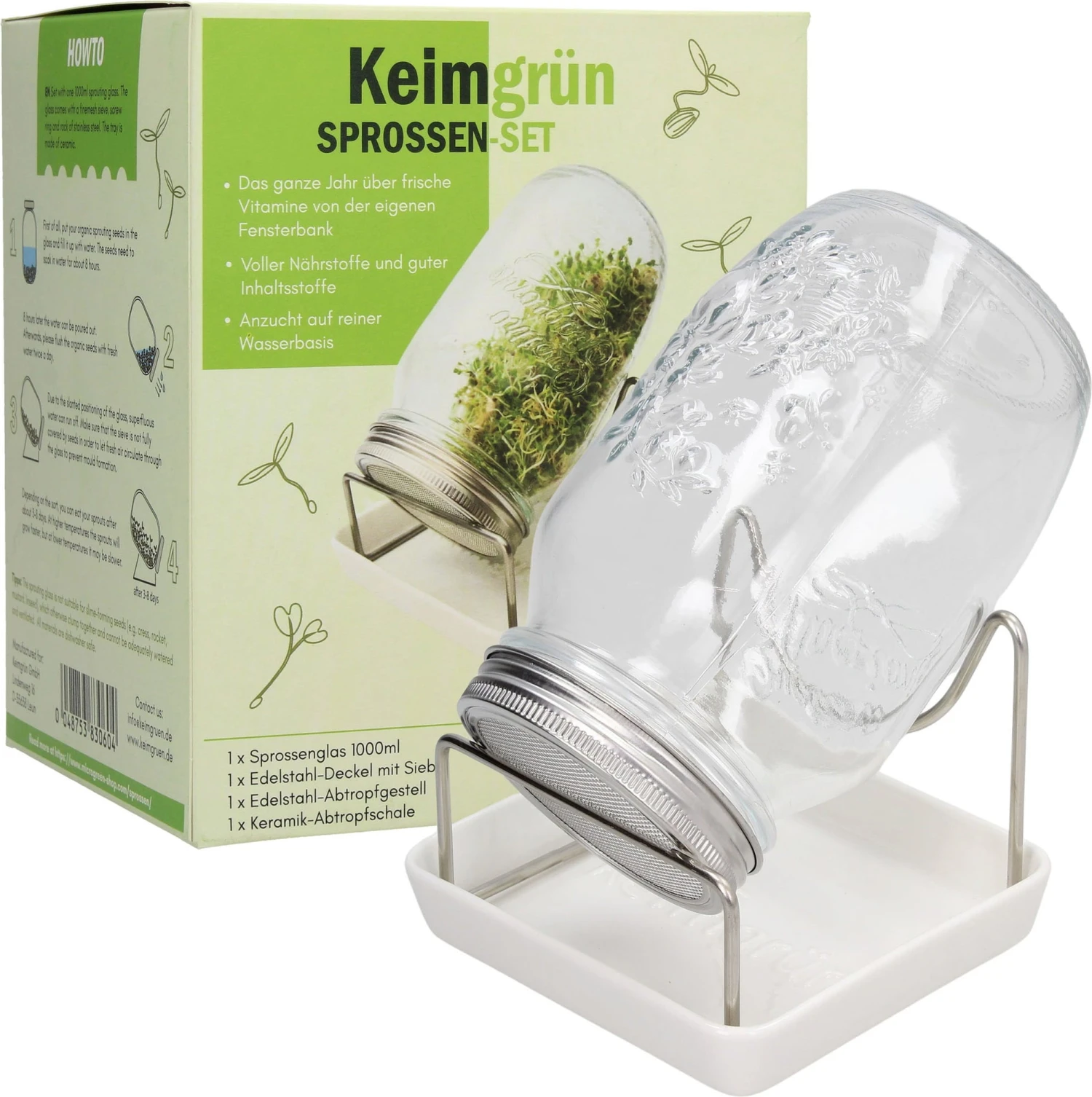 - Lieferumfang: 1 Sprossenglas, 1 Edelstahldeckel mit Sieb, 1 Edelstahl-Abtropfgestehl, 1 Keramik-Abtropfschale