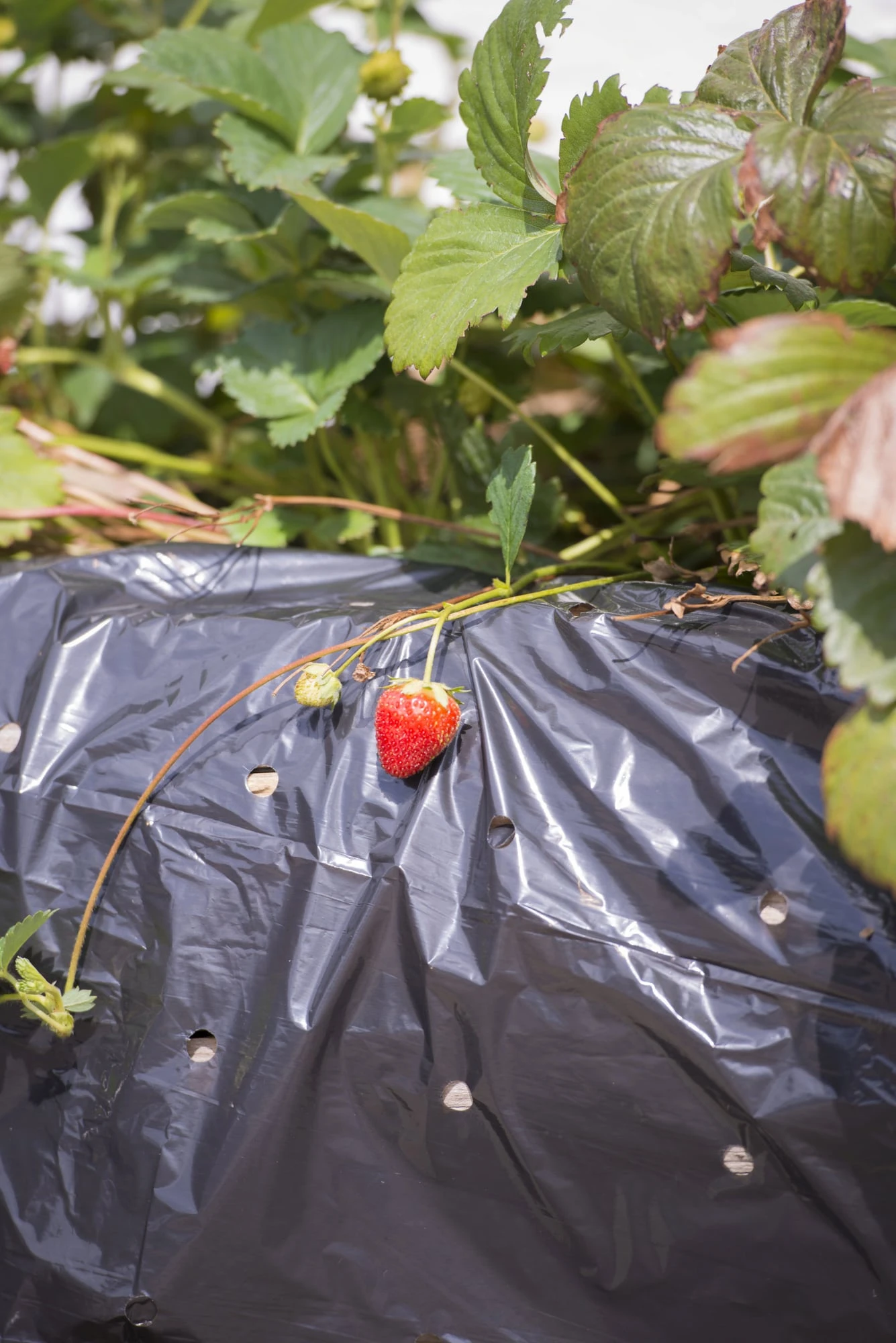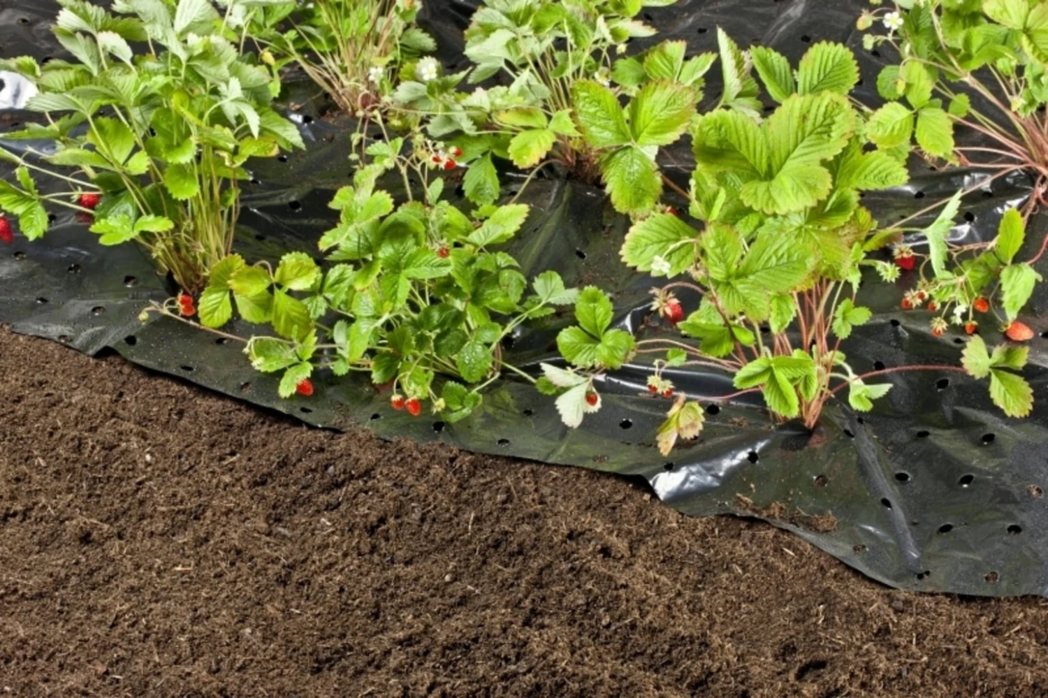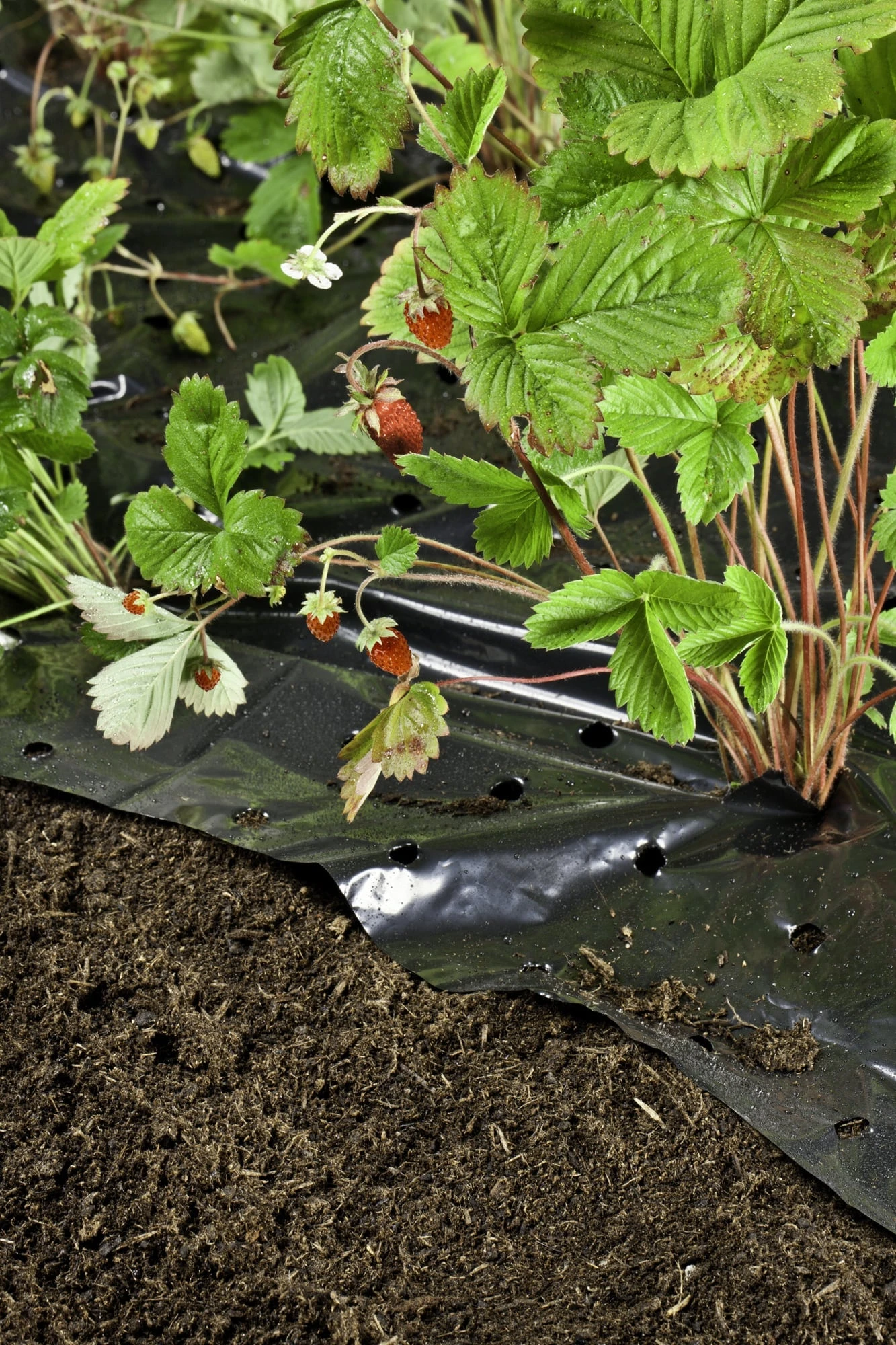 Die schwarze UV-beständige Folie sorgt für eine natürliche Unkrautbekämpfung sowie für Wachstumsförderung von Erdbeeren und anderen Obst- und Gemüsesorten. Die Lochung schafft einen optimalen Wärmeaustausch und macht so eine frühere Ernte möglich.